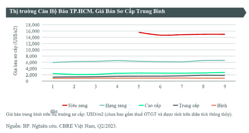 Báo cáo của CBRE Việt Nam chỉ ra, giá trung bình căn hộ thị trường sơ cấp trong quý II/2023 đạt mức dưới 60 triệu đồng/m2, giảm 4,8% so với quý trước.