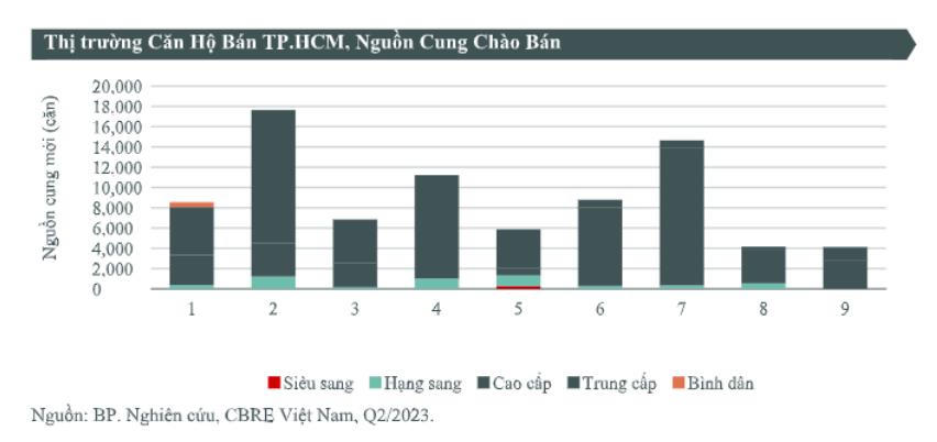 Mặt khác, phân khúc căn hộ trung cấp có sự cải thiện nhẹ, với hơn 1.200 căn hộ được mở bán mới trong 6 tháng đầu năm 2023, tăng 9% so với cùng kỳ năm trước. Khu Đông tiếp tục là nơi tập trung nhiều nguồn cung căn hộ mới, với hơn 80% nguồn cung mới đều đến từ TP. Thủ Đức.
