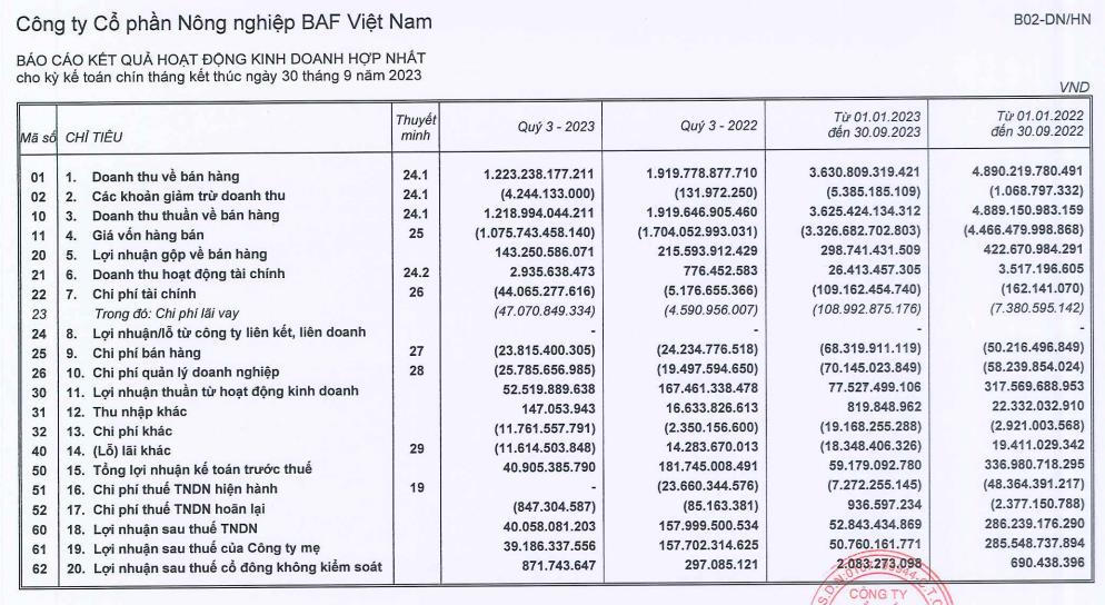 Báo cáo tài chính quý III/2023 của Công ty cổ phần Nông nghiệp BaF (mã ck: BAF) ghi nhận kết quả không mấy tươi sáng.