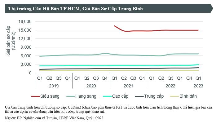 Giá bán căn hộ trung bình trong quý I/2023 tăng 2% so với quý trước và 10,2% so với cùng kỳ năm ngoái, nằm ở mức trên 60 triệu đồng/m2. Mức tăng này chủ yếu đến từ một phân khu của dự ánVinhomes Grand Park, nơi tập trung nhiều nguồn cung của quý này.
