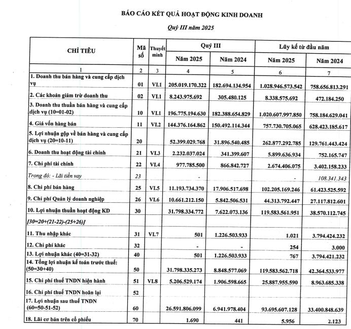 Doanh thu hoạt động tài chính tăng mạnh, đạt hơn 2,2 tỷ đồng, gấp 6,5 lần cùng kỳ, nhờ lãi tiền gửi ngân hàng tăng mạnh. Trong khi đó, chi phí tài chính chỉ tăng nhẹ lên mức 978 triệu đồng.