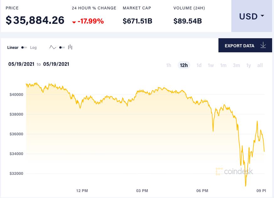 Sau khi mất mốc 40.000 USD, Bitcoin, đồng tiền số có vốn hóa lớn nhất thị trường tiếp tục lao dốc gần 22%, lùi về dưới 32.000 USD, xong lại tăng nhẹ trở lại về mốc 35.000 USD. Giá trị vốn hóa thị trường mất mốc 600 tỷ USD. Nếu tính từ mức đỉnh gần 65.000 USD thiết lập ngày 14/4, Bitcoin đã sụt hơn 50%.