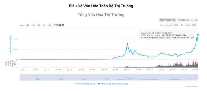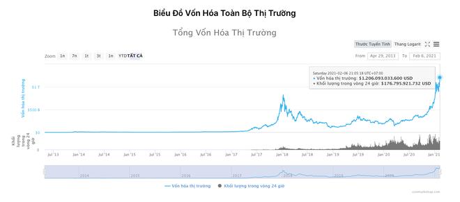 Tính từ đầu năm 2021 đến nay, đồng Bitcoin đã tăng giá trị 37,36%, nâng tổng giá trị vốn hóa thị trường lên 749,43 tỷ USD. Đà tăng của Bitcoin đã giúp tổng giá trị vốn hóa của thị trường tiền mã hóa đạt mức kỷ lục hơn 1.200 tỷ USD.