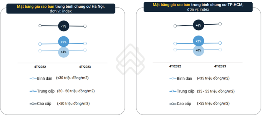 Theo dữ liệu của Batdongsan.com.vn, trong 4 tháng đầu năm 2023, giá rao bán chung cư ở Hà Nội và TP.HCM gần như đi ngang ở tất cả các phân khúc. So với cùng kỳ năm trước, giá rao bán chung cư Hà Nội tăng nhẹ từ 2-4% ở phân khúc bình dân và trung cấp, giảm 1% đối với phân khúc cao cấp. Tại TP.HCM, chung cư bình dân không có bất kỳ thay đổi nào về giá rao bán, chung cư trung cấp có giá tăng 2%, trong khi chung cư cao cấp tăng giá 6%.