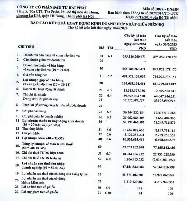 Năm nay, Hải Phát đặt kế hoạch doanh thu 2.800 tỷ đồng, tăng 67% so với năm 2023; lợi nhuận sau thuế 105 tỷ đồng, giảm 22%. Như vậy với kết quả đạt được sau 6 tháng, công ty đã hoàn thành 45% kế hoạch lợi nhuận.