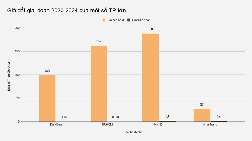Theo khảo sát của Zing, so sánh với các địa phương khác, giá đất cao nhất tại Đà Nẵng đang cao gấp 3,6 lần mức cao nhất 27 triệu đồng/m2 tại tỉnh Khánh Hòa (khu vực Nha Trang), cao gấp rưỡi mức 65 triệu đồng/m2 tại Huế, gấp khoảng 2,5 lần mức 40 triệu đồng/m2 tại Đồng Nai... Giá đất Đà Nẵng chỉ thấp hơn Hà Nội (cao nhất 188 triệu/m2) và TP HCM (cao nhất 162 triệu/m2).
