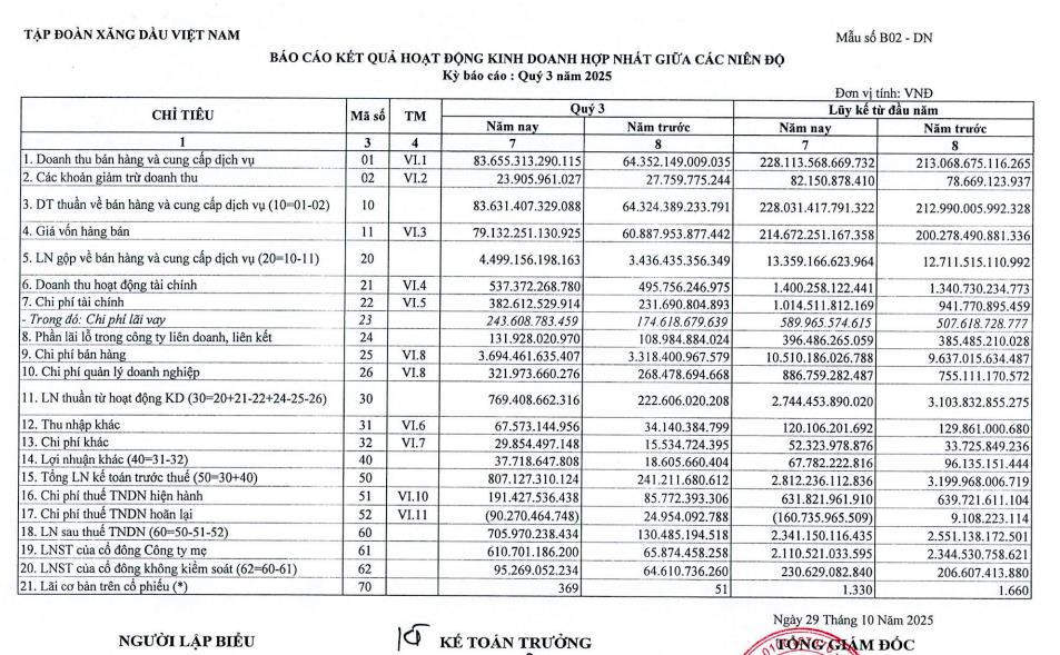 Tập đoàn Xăng dầu Việt Nam (Petrolimex, mã ck: PLX) vừa công bố báo cáo tài chính hợp nhất quý III/2025 với kết quả phục hồi mạnh so với cùng kỳ.