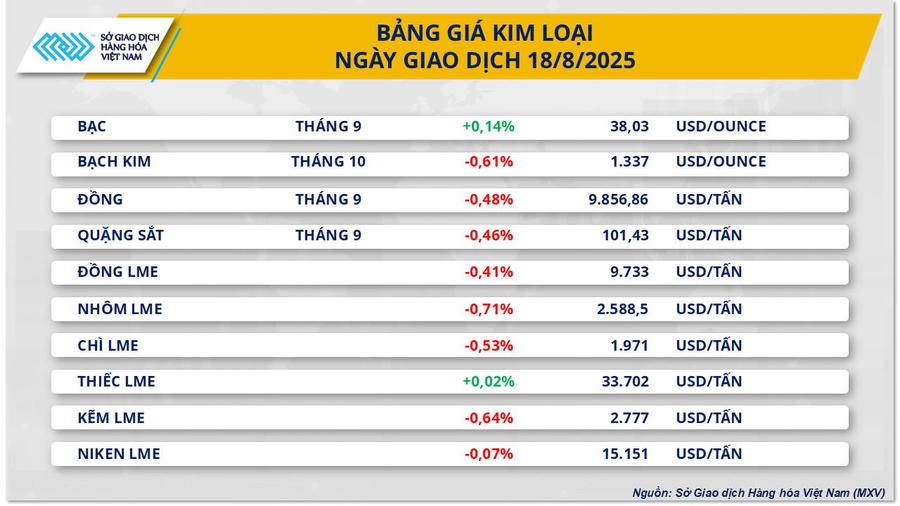 Khép lại phiên giao dịch đầu tuần, thị trường kim loại chứng kiến lực bán áp đảo khi 8/10 mặt hàng đồng loạt giảm giá. Hợp đồng quặng sắt kỳ hạn tháng 9 nối dài chuỗi giảm sang phiên thứ 4 liên tiếp, giảm gần 0,5% xuống 101,43 USD/tấn.