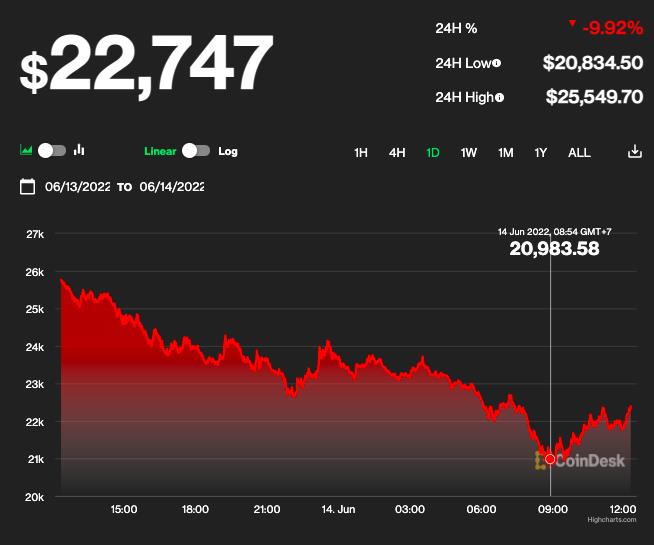Trên sàn CoinMarketCap, giá đồng Bitcoin tiếp đà lao dốc về quanh mốc 22.000 USD - mức thấp nhất kể từ tháng 12/2020. Có thời điểm, đồng tiền ảo này lùi sâu về mốc 20.983 USD rồi "hồi" nhẹ trở lại.
