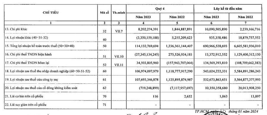 Tuy nhiên giá vốn hàng bán tăng mạnh tới gần 700 tỷ đồng dẫn đến lợi nhuận gộp 'bốc hơi' gần 80% về còn 332 tỷ đồng. Lợi nhuận sau thuế đạt gần 107 tỷ đồng, giảm 90,44% so với quý IV/2022.