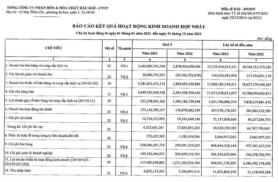 Giải trình biến động lợi nhuận giảm mạnh, theo ban lãnh đạo doanh nghiệp, giá bán mặt hàng phân bón và hóa chất quý IV/2023 giảm so với cùng kỳ năm trước đặc biệt là giá bán Ure giảm 30%, giá bán NH3 giảm 40%. Trong khi đó, giá khí tăng cao so với quý IV/2022 dẫn đến lợi nhuận giảm sâu.