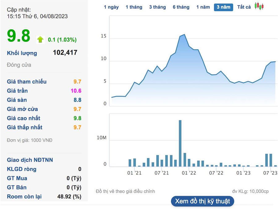 Với mức giá đóng cửa 9.800 đồng/cp thì giá trị khối tài sản cổ phiếu của Tân Chủ tịch HBS đang có trị giá vào khoảng 49 tỷ đồng.