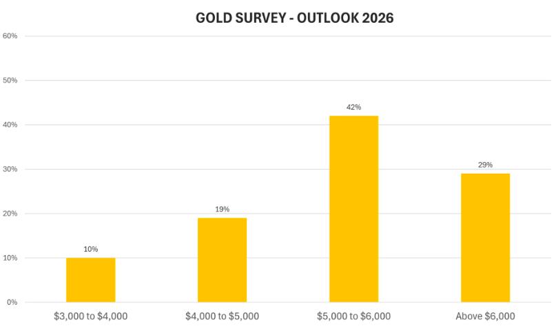 Trong đó, 138 nhà đầu tư cá nhân, chiếm 29% tổng số người tham gia khảo sát, dự đoán giá vàng sẽ giao dịch trên mức 6.000 USD/ounce vào năm nay. Phần lớn các nhà đầu tư nhỏ lẻ, chiếm 42%, tương đương 197 nhà đầu tư, dự đoán giá vàng sẽ giao dịch trong khoảng từ 5.000 - 6.000 USD/ounce vào năm 2026.