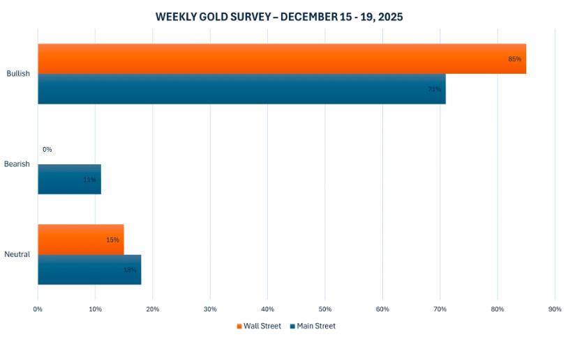 Khảo sát vàng hàng tuần mới nhất với các chuyên Phố Wall cho thấy nhiều dự báo lạc quan về triển vọng ngắn hạn của giá vàng, trong khi các nhà đầu tư cá nhân cũng gia tăng nhẹ tỉ lệ nghiêng về xu hướng tăng.
