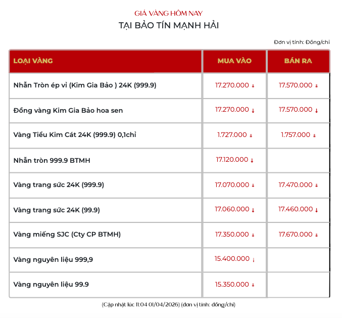 Cùng lúc đó, giá vàng miếng SJC tại Bảo tín Mạnh Hải niêm yết tại 173,5 - 176,7 triệu đồng/lượng.