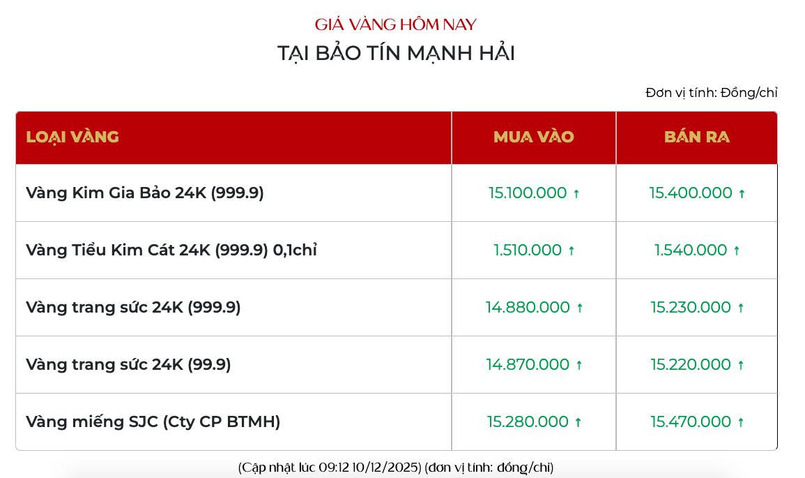 Trong khi đó, giá vàng SJC tại Bảo tín Mạnh Hải điều chỉnh tăng, hiện niêm yết tại 152,8 - 154,7 triệu đồng/lượng (mua - bán). Chênh lệch giá mua - bán là 1,9 triệu đồng/lượng.