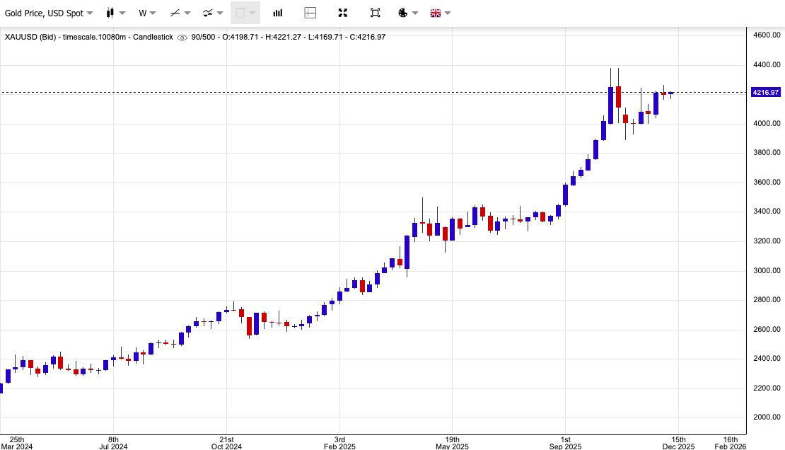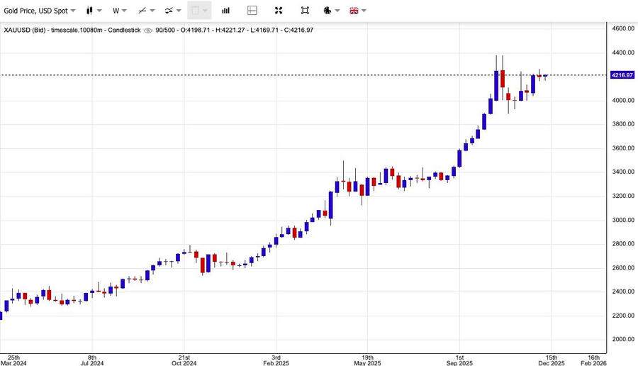 Chốt phiên giao dịch, giá vàng giao ngay tăng 0,6% lên 4.212 USD/ounce và giá vàng giao tháng 2 tăng 0,4% lên 4.236 USD/ounce.