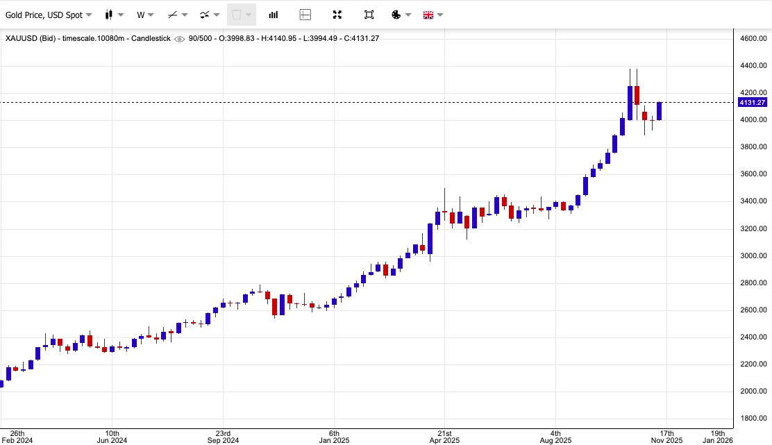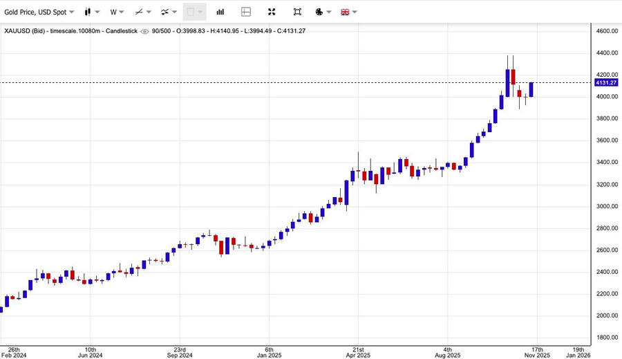 Giá vàng giao ngay hiện niêm yết giao dịch tại 4.131 USD/ounce, và giá vàng giao tháng 12 tăng 0,11% lên 4.128 USD/ounce.