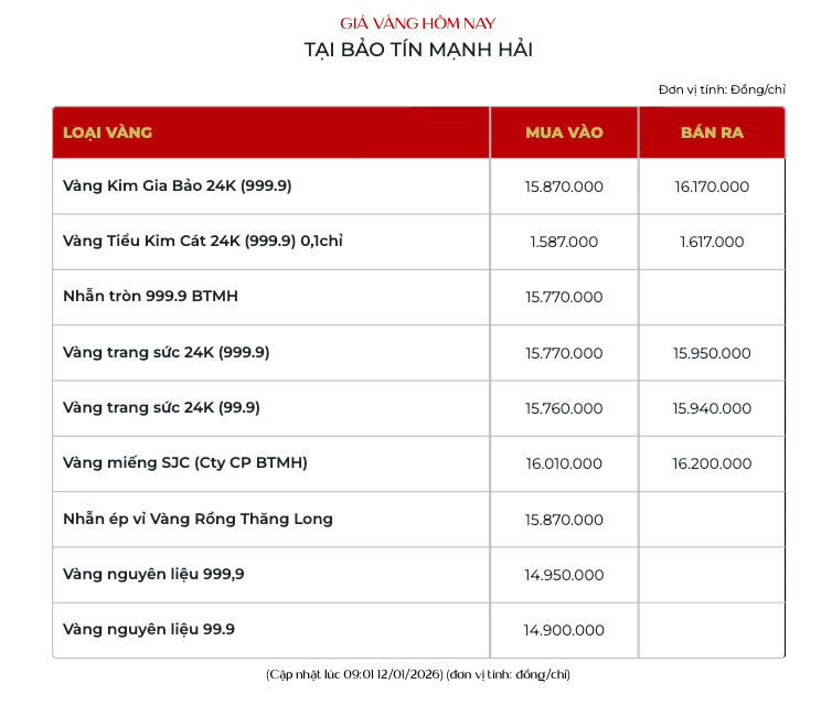 Vàng Kim Gia Bảo của Bảo tín Mạnh Hải niêm yết tại 158,7 - 161,7 triệu đồng/lượng.