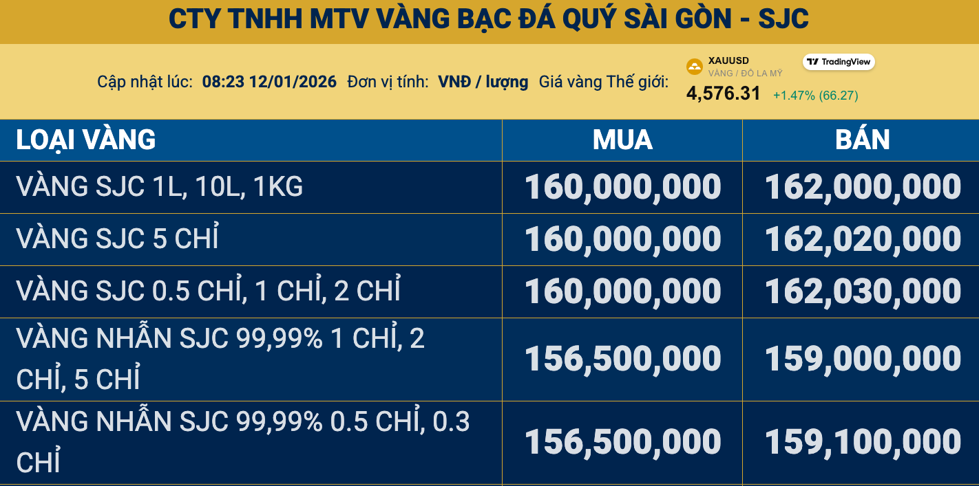 Hiện công ty Vàng bạc Đá quý Sài Gòn (SJC), Tập đoàn Doji, Phú Quý và hệ thống PNJ đồng loạt điều chỉnh tăng 2 triệu đồng/lượng ở cả hai chiều mua vào và bán ra. Theo đó, giá mua được nâng lên 160 triệu đồng/lượng, trong khi giá bán ra chạm mốc 162 triệu đồng/lượng.