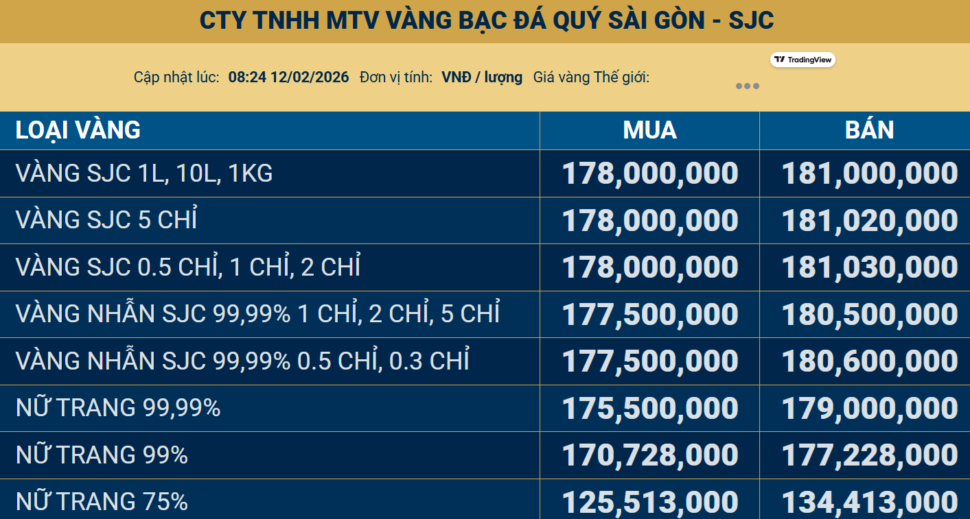 Tại Công ty Vàng bạc Đá quý Sài Gòn (SJC), Tập đoàn Doji, Phú Quý và hệ thống PNJ đồng loạt giữ nguyên giá vàng miếng ở cả hai chiều mua vào - bán ra. Theo đó, giá mua dao động quanh 177,5 - 178 triệu đồng/lượng, trong khi giá bán phổ biến ở mức 181 triệu đồng/lượng.