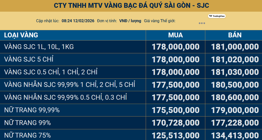 Giá vàng giao ngay tăng 1% lên 5.074 USD/ounce, sau khi chạm đỉnh phiên ở 5.118 USD trước khi điều chỉnh nhẹ. Giá vàng giao tháng 4 tăng 1,3% lên 5.098 USD/ounce. Đến sáng ngày 12/2, thị trường điều chỉnh nhẹ, giá vàng giao ngay giảm 0,3% xuống 5.068 USD/ounce, theo kitco, và giá vàng giao tháng 4 giảm 0,43% xuống 5.086 USD.