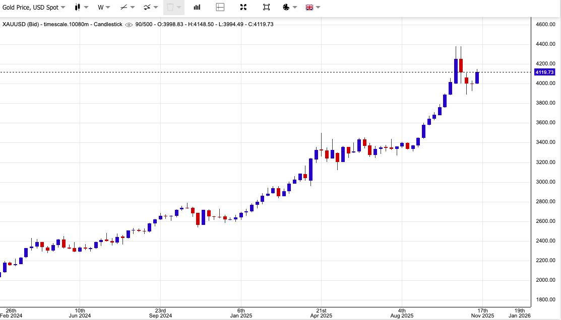 Trong phiên giao dịch sáng ngày 12/11, giá vàng giao ngay tăng 0,42% lên 4.143,1 USD/ounce, theo Kitco, và giá vàng giao tháng 12 tăng 0,38% lên 4.149 USD.