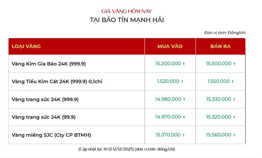 Cùng lúc đó, giá vàng trang sức 24K tại Bảo tín Mạnh Hải niêm yết giao dịch tại 149,8 - 153,2 triệu đồng/lượng.
