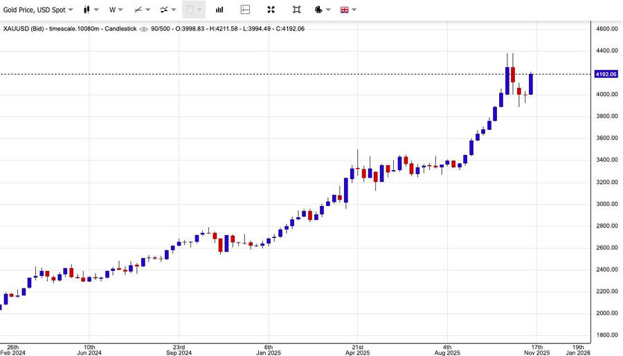 Giá vàng giao ngay tăng 2% lên 4.209 USD/ounce, mức cao nhất kể từ ngày 21/10. Giá vàng giao tháng 12 tại Mỹ cũng tăng 2,4% lên 4.214 USD/ounce.
