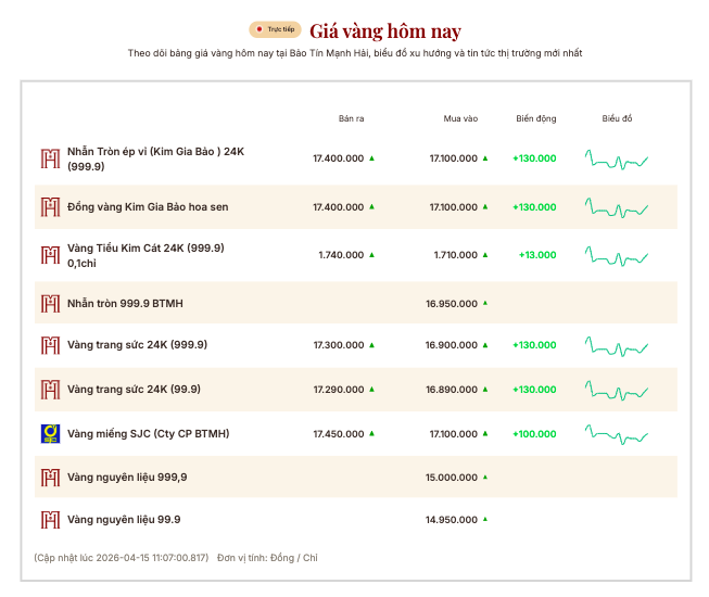 Vàng nhẫn Kim Gia Bảo tại Bảo tín Mạnh Hải niêm yết tại 171 - 174 triệu đồng/lượng.