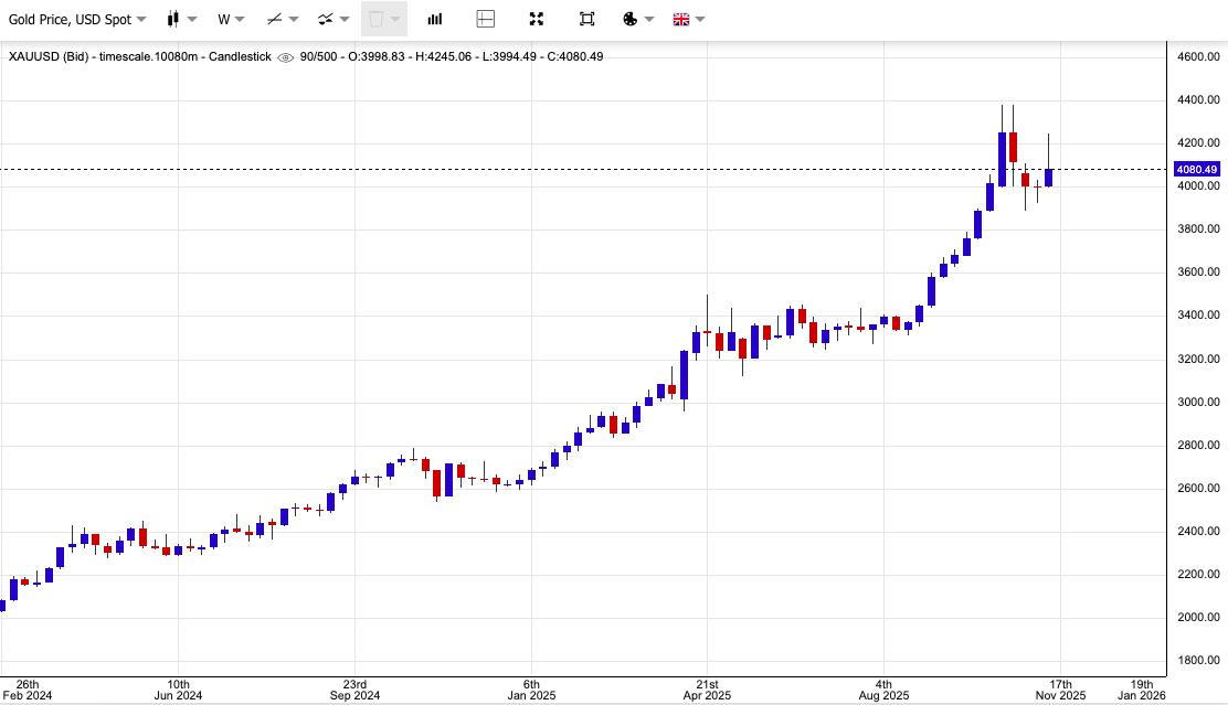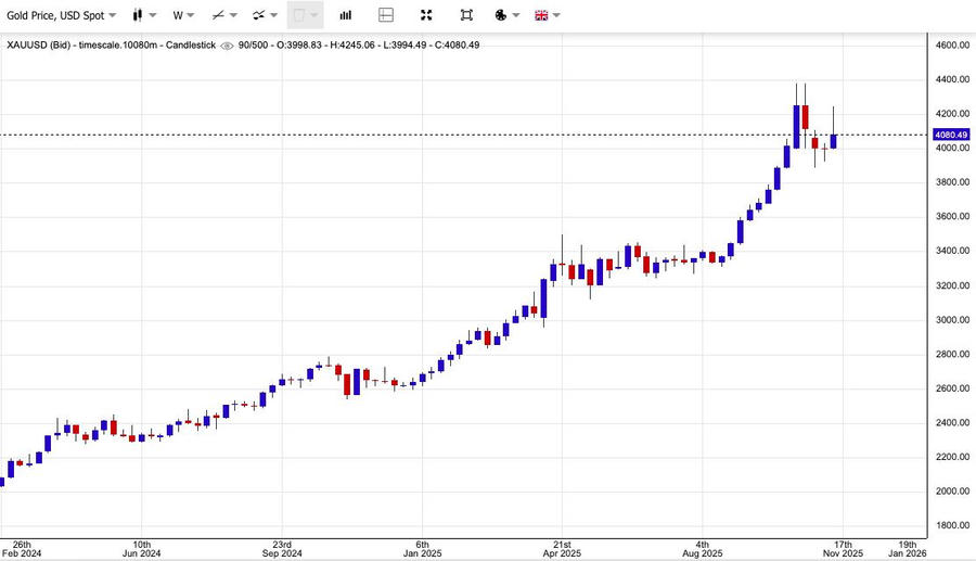 Chốt phiên giao dịch cuối tuần, giá vàng giao ngay giảm 2,15% xuống 4.080,7 USD/ounce, sau khi có thời điểm giảm hơn 3% trong phiên, theo Reuters. Giá vàng giao tháng 12 cũng giảm sâu 2,6% xuống còn 4.086 USD/ounce.