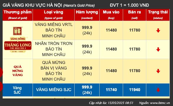 Mở phiên sáng ngày 15/5, giá vàng miếng SJC được Công ty Vàng bạc đá quý Sài Gòn SJC niêm yết ở ngưỡng 117,4 triệu đồng/ lượng (mua vào) và bán ra ở mức 119,4 triệu đồng/lượng, giảm 500.000 đồng/lượng cả hai chiều so với chiều qua. Chênh lệch giá mua vào - bán ra ở ngưỡng 2 triệu đồng/lượng.