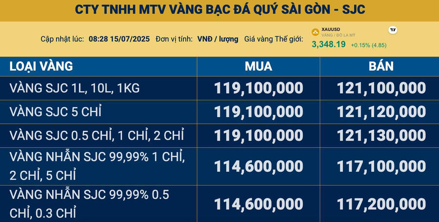 Giá vàng ngày 15/7: Vàng thế giới giảm nhẹ, vàng miếng SJC về sát ngưỡng 121 triệu đồng/lượng
