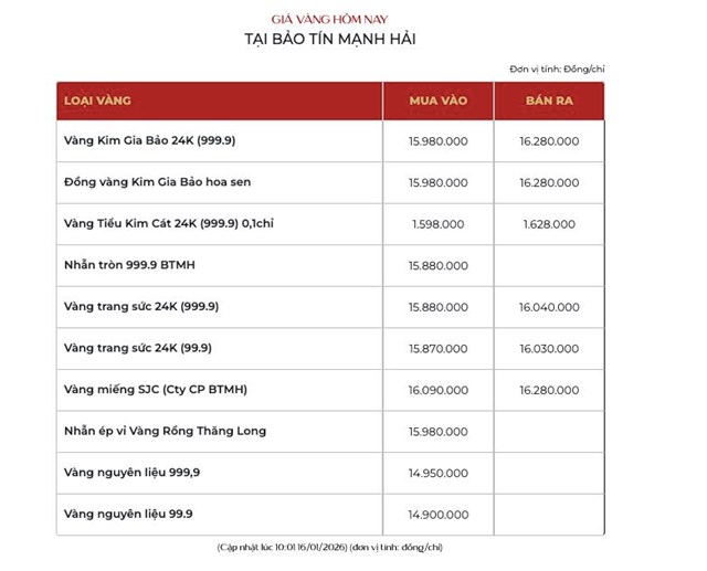 Vàng Kim Gia Bảo của Bảo tín Mạnh Hải niêm yết tại 159,8 - 162,8 triệu đồng/lượng.