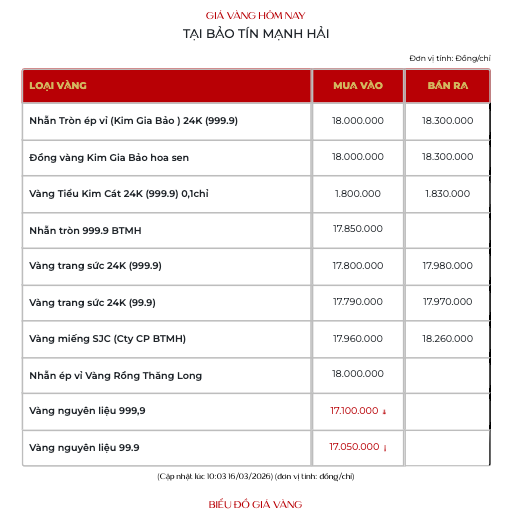 Cùng lúc đó, Vàng nhẫn Bảo tín Mạnh Hải niêm yết tại 180 - 183 triệu đồng/lượng.