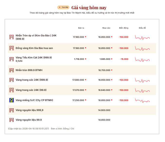 Giá vàng ngày 16/4: Vàng thế giới giảm 1%, vàng miếng SJC lùi về mức 172 triệu đồng/lượng