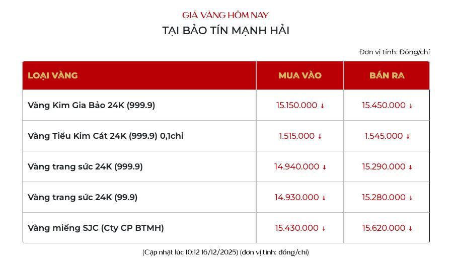 Cùng lúc đó, giá vàng trang sức 24K tại Bảo tín Mạnh Hải niêm yết giao dịch tại 149,4 - 152,9 triệu đồng/lượng
