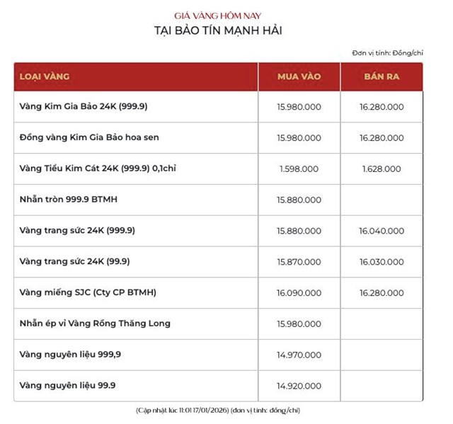 Cùng chiều diễn biến, giá vàng nữ trang đi ngang, niêm yết tại 157,2 - 159,7 triệu đồng/lượng. Vàng Kim Gia Bảo của Bảo tín Mạnh Hải niêm yết tại 159,8 - 162,8 triệu đồng/lượng.