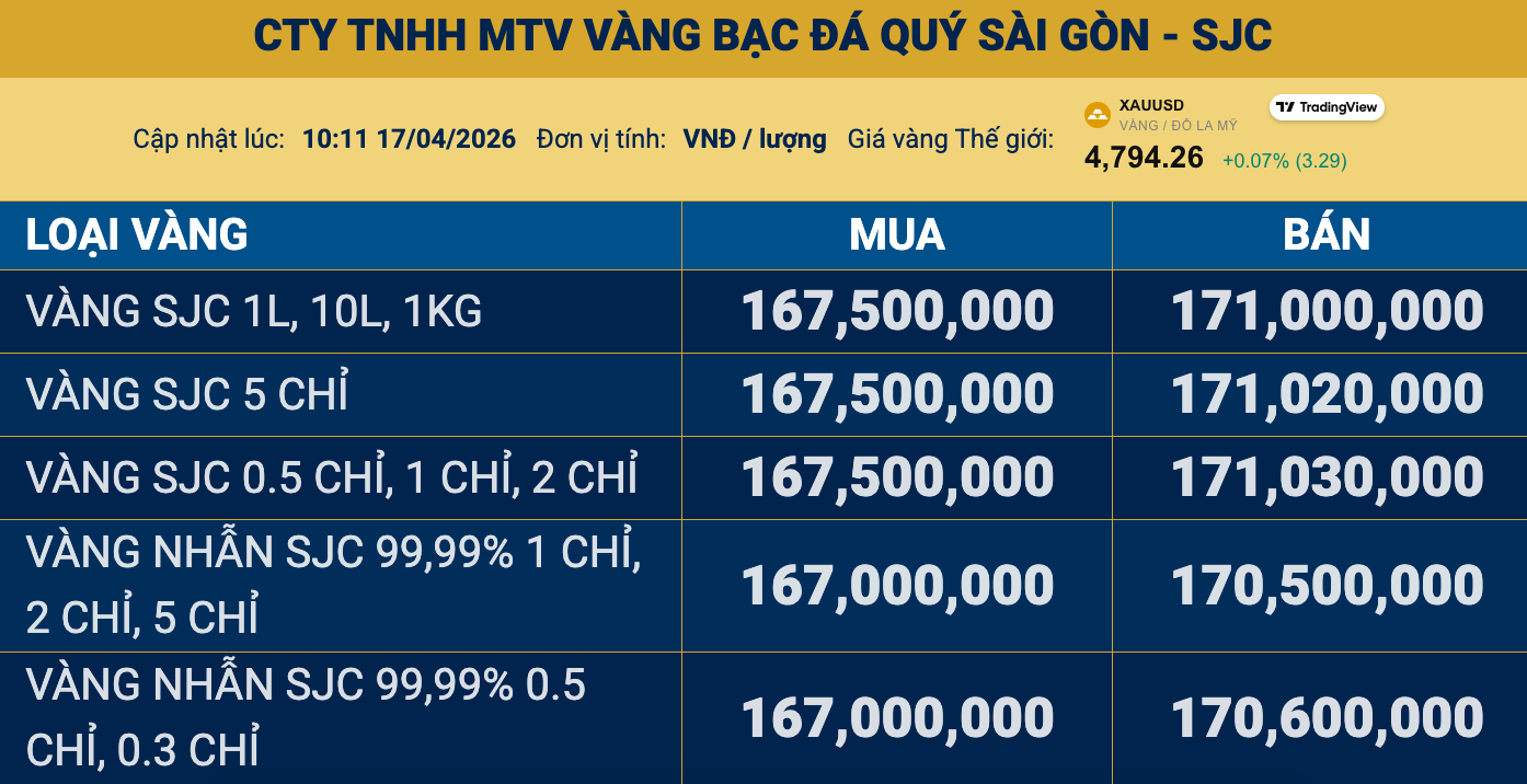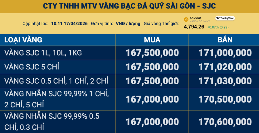 Cụ thể, tại Công ty Vàng bạc đá quý Sài Gòn (SJC), Tập đoàn Doji, Phú Quý và hệ thống PNJ, giá vàng SJC đồng loạt giảm thêm 1 triệu đồng/lượng ở cả hai chiều, đưa giá giao dịch về quanh 167,5 – 171 triệu đồng/lượng.