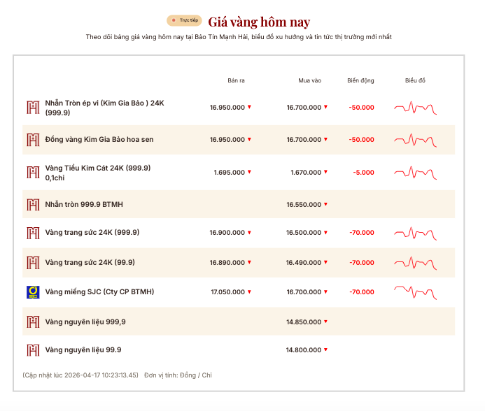Trong đó, Công ty SJC điều chỉnh giảm hơn 1 triệu đồng/lượng theo cả hai chiều mua và bán, kéo giá về vùng 167 - 170,5 triệu đồng/lượng. Vàng Kim Gia bảo tại Bảo tín Mạnh Hải niêm yết tại 167 - 169 triệu đồng/lượng.