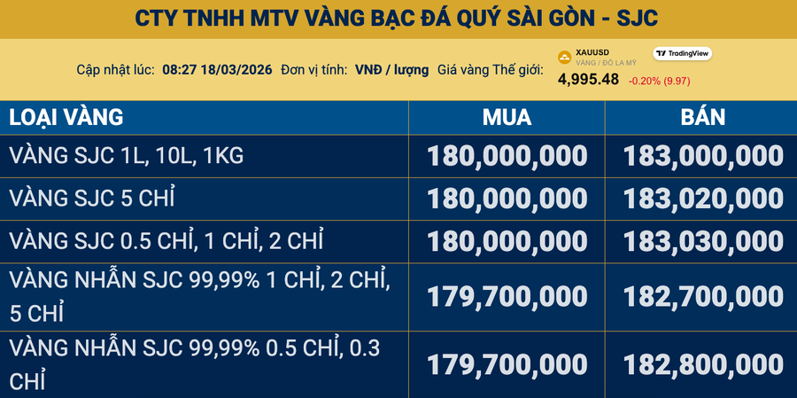 Giá vàng giao ngay gần như đi ngang ở 5.004 USD/ounce và giá vàng giao tháng 4 tăng 0,1% lên 5.008 USD, theo Reuters. Trong phiên giao dịch sáng ngày 18/3, giá vàng thế giới mất mốc 5.000 USD/ounce, hiện niêm yết giao dịch tại 4.995 USD/ounce.