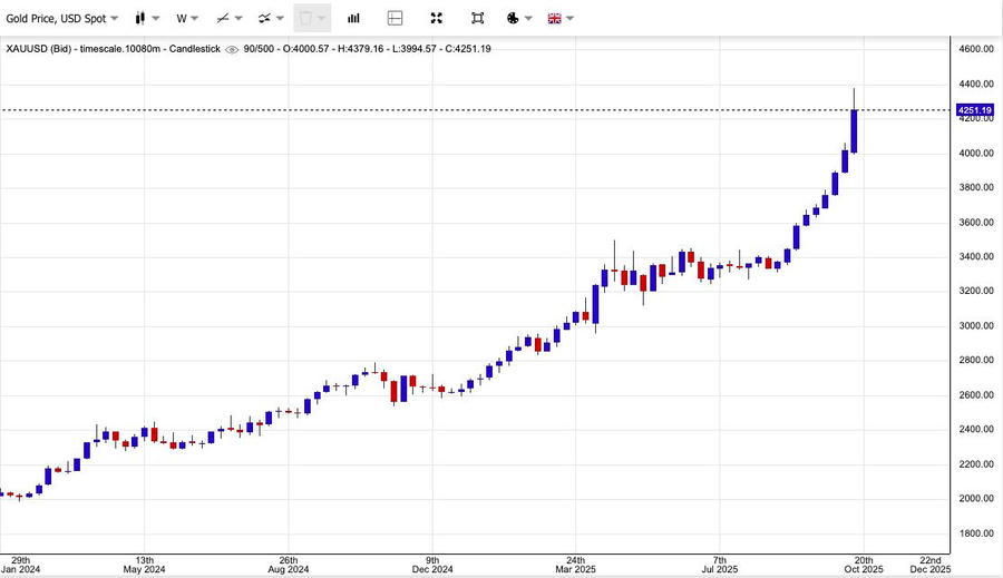 Chốt phiên giao dịch cuối tuần, giá vàng giao ngay giảm 1,72% xuống 4.250,8 USD/ounce, sau khi đạt mức cao kỷ lục 4.378,69 USD vào đầu phiên. Hôm 16/10, kim loại quý này đã lần đầu tiên vượt mốc 4.300 USD/ounce và tính chung cả tuần, vàng vẫn ghi nhận mức tăng khoảng 4,8%.