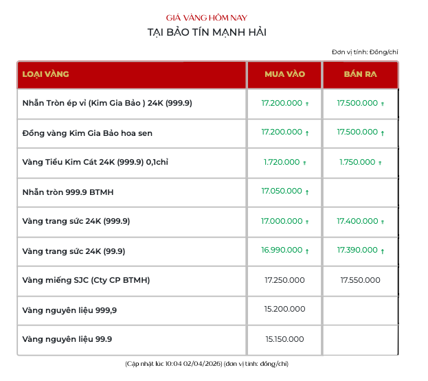 Cùng lúc đó, giá vàng SJC tại Bảo tín Mạnh Hải niêm yết tại 172,5 - 175,5 triệu đồng/lượng.