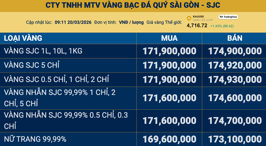 Giá vàng ngày 20/3: Vàng thế giới tiếp đà giảm, vàng miếng SJC giảm xuống dưới 175 triệu đồng/lượng