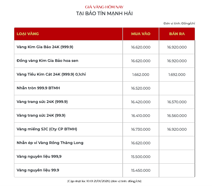Cùng chiều diễn biến, giá vàng nữ trang tăng mạnh, niêm yết tại 165,1 - 167,6 triệu đồng/lượng. Vàng Kim Gia Bảo của Bảo tín Mạnh Hải niêm yết tại 166,2 - 169,2 triệu đồng/lượng.