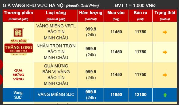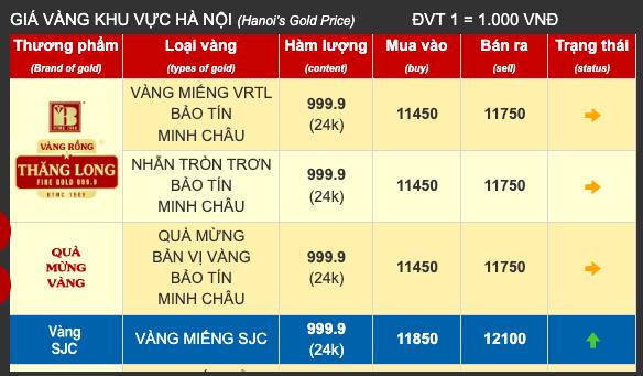Giá vàng SJC tại Công ty TNHH Bảo Tín Minh Châu được doanh nghiệp giao dịch ở mức 118,5 -121 triệu đồng/lượng (mua vào - bán ra), mức giá tăng 1,7 triệu đồng/lượng ở cả hai chiều mua - bán so với hôm qua.