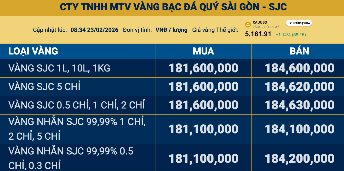 Cụ thể, Công ty SJC điều chỉnh tăng 3,6 triệu đồng/lượng mỗi chiều, niêm yết ở mức 181,1 - 184,1 triệu đồng/lượng.