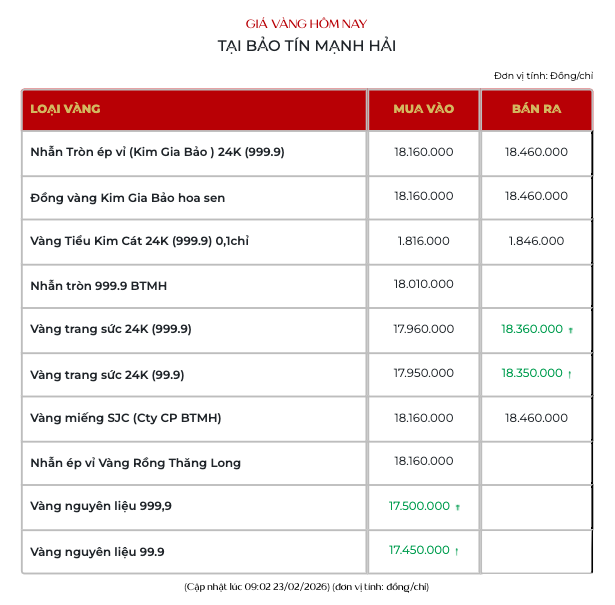 Vàng nhẫn tròn 999.9 thương hiệu Bảo Tín Mạnh Hải niêm yết giá ở mức 181,6 - 184,6 triệu đồng/lượng.