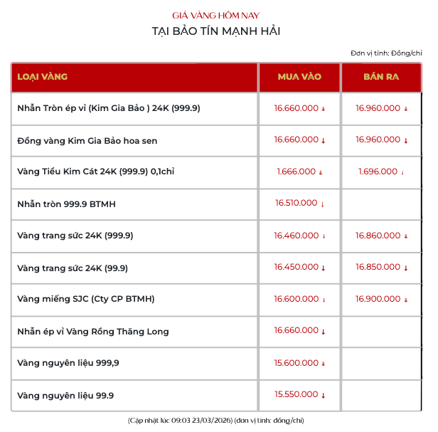 Giá vàng miếng SJC tại Bảo tín Mạnh Hải giảm 2 triệu đồng/lượng ở cả hai chiều, hiện niêm yết tại 166 - 169 triệu đồng/lượng.