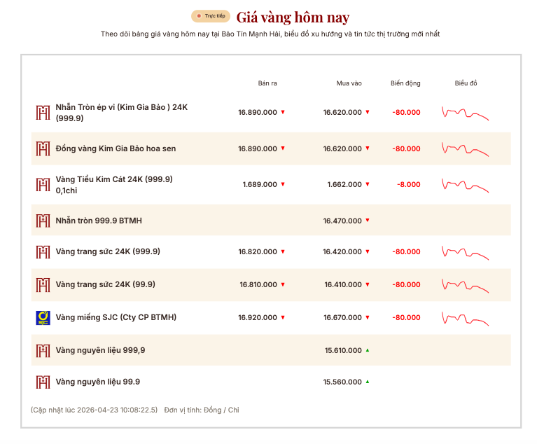 Trong khi đó, vàng miếng SJC tại Bảo tín Mạnh Hải cũng niêm yết giao dịch tại 166,7 - 169,2 triệu đồng/lượng.